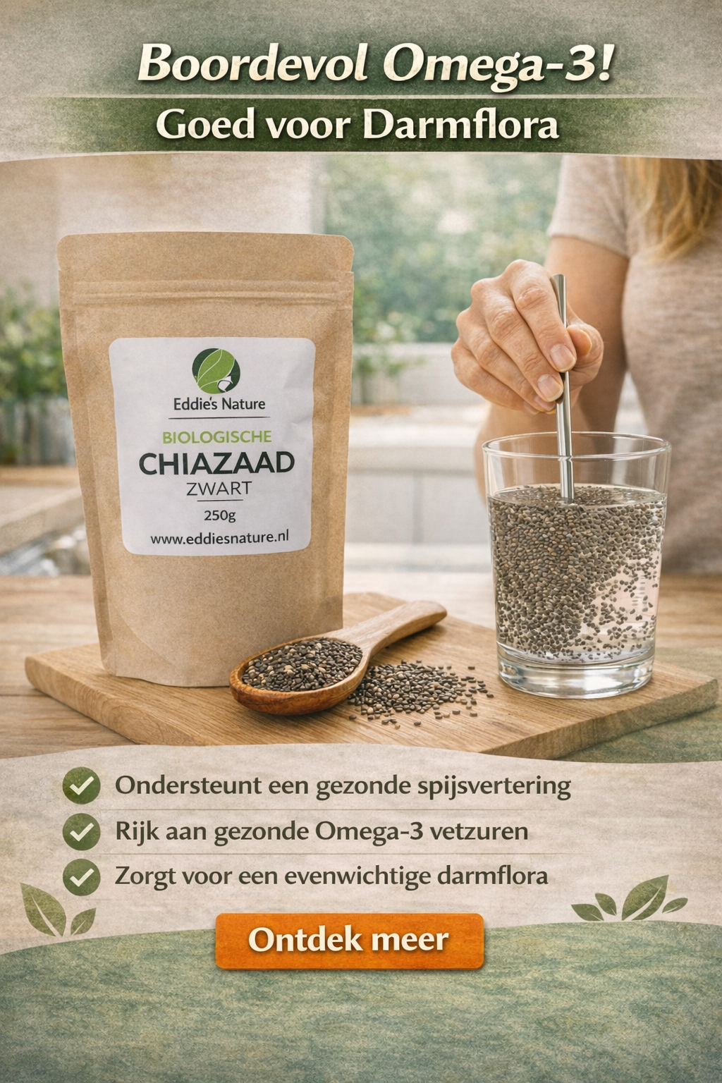 Veel visolie van tegenwoordig is sterk bewerkt, waardoor de opname van omega-3 kan afnemen. Chiazaad is een puur en plantaardig alternatief dat van nature rijk is aan omega-3 vetzuren. Deze vetzuren ondersteunen de hersenfunctie en mentale helderheid. In tegenstelling tot visolie blijft chiazaad dicht bij zijn natuurlijke vorm. Een eenvoudige, voedzame keuze voor wie bewust met gezondheid bezig is.