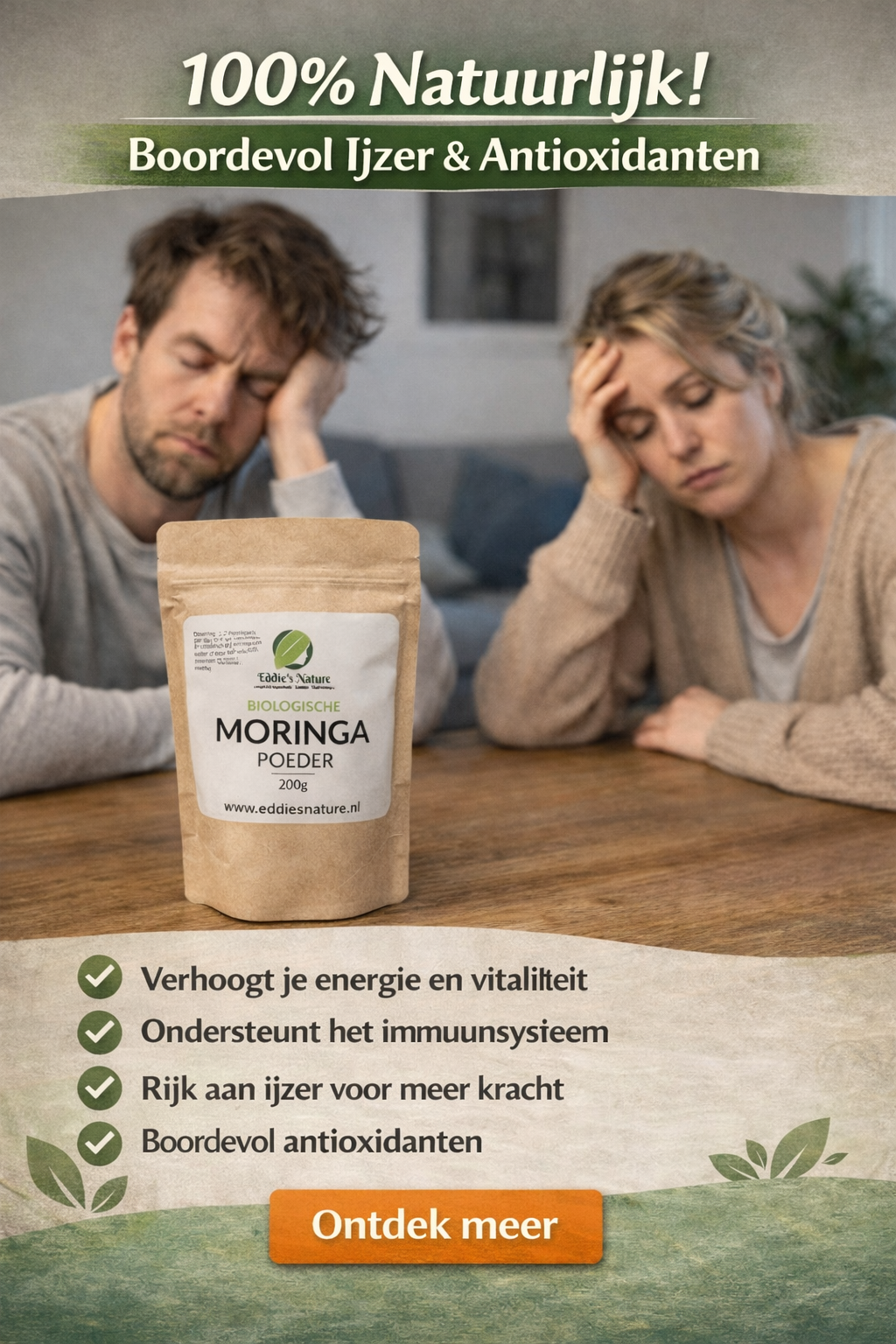 Voel je je vaak moe, futloos of snel uitgeput? Biologische moringa is van nature rijk aan ijzer, vitamines en mineralen die het lichaam ondersteunen bij het aanvullen van tekorten. Het helpt je energieniveau op een natuurlijke manier te ondersteunen en draagt bij aan een normale weerstand. Ideaal voor momenten waarop je lichaam extra voeding kan gebruiken. Een pure, plantaardige boost om je weer sterker en vitaler te voelen.